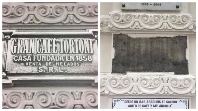 El staff del Café Tortoni denunció el robo de la placa fundacional de bronce de la emblemática cafetería porteña fundada en 1858 sobre la Avenida de Mayo.