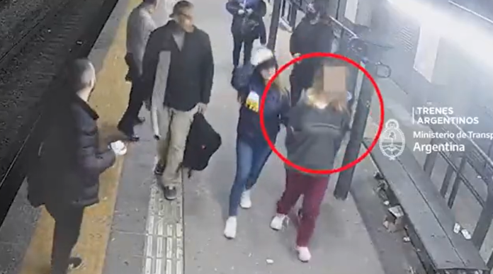 En las imágenes se puede ver cómo la joven se sube al tren en la estación Retiro e inmediatamente cuando se baja en Palermo la estaban esperando dos oficiales de la Policía Federal, que la pusieron las esposas y la escoltaron hasta la comisaría.