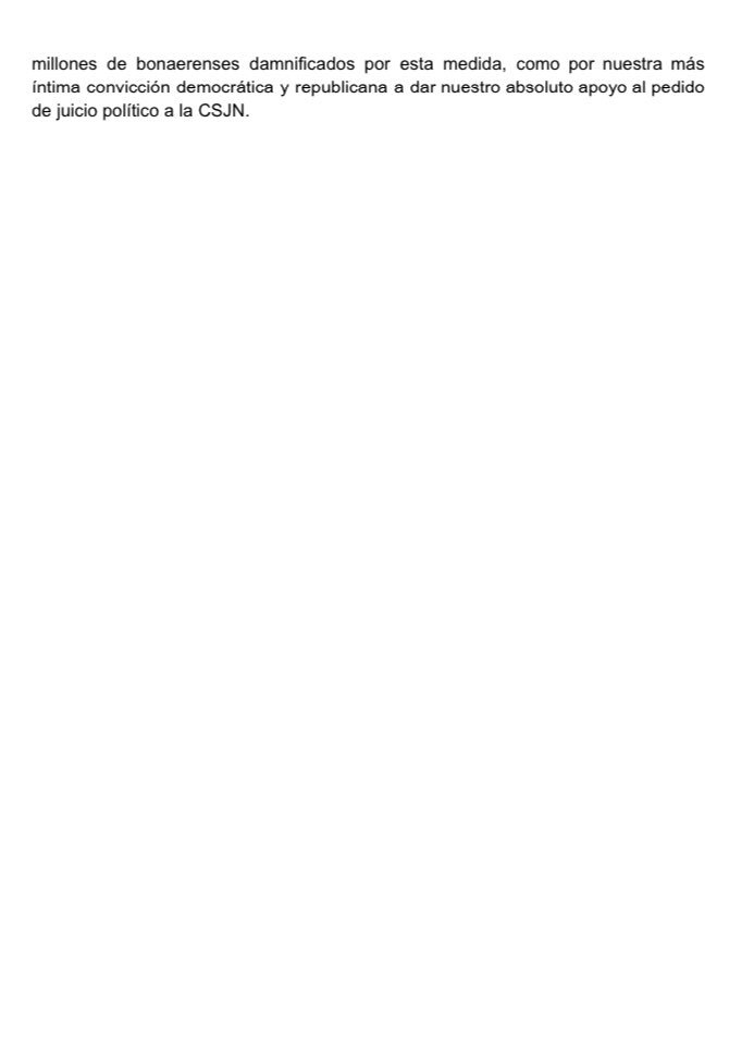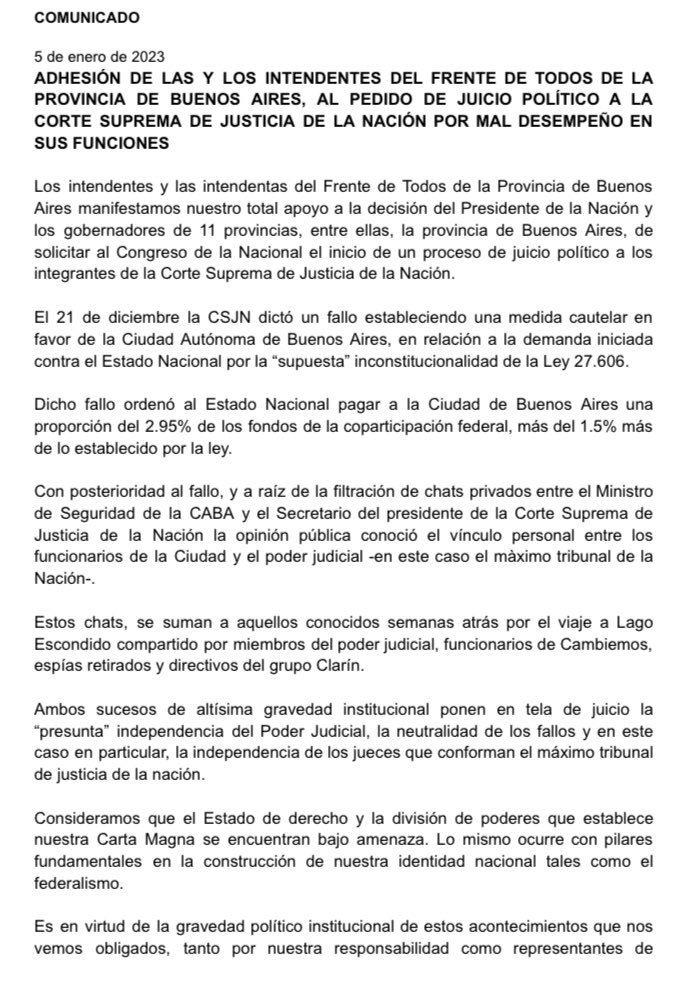Sobre el final del texto, destacaron que ante «la gravedad político institucional de estos acontecimientos» se ven «obligados, tanto por nuestra responsabilidad como representantes de millones de bonaerense damnificados por esta medida, como por nuestra más íntima convicción democrática y republicana a dar nuestro absoluto apoyo al pedido de juicio político a la CSJN».
