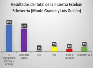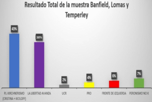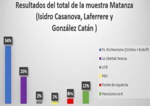 La Libertad Avanza posee un 30% de piso y pese a que la muestra propuso escindido al PRO, se da como naturalmente que irán en conjunto. Un 5% de entrevistados, incluso refirió a los entrevistadores que preferirían que vayan juntos. Salvo en la Matanza, dónde el piso baja al 26% y en Esteban Echeverría dónde junto al PRO superan el 40%, en el resto de los distritos ambas fuerzas, tomadas juntas, promedian el 35%.