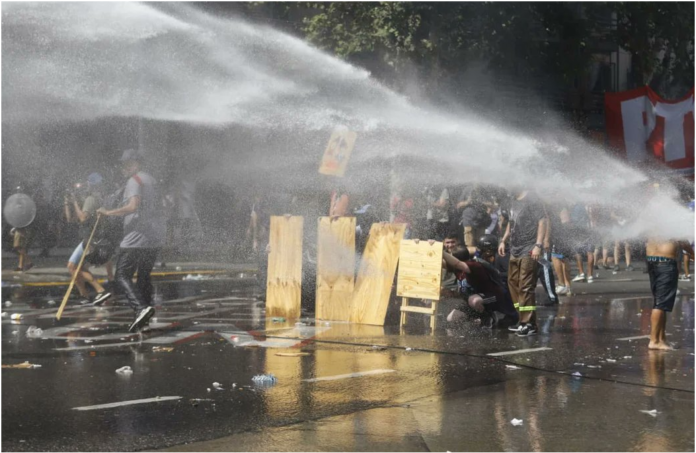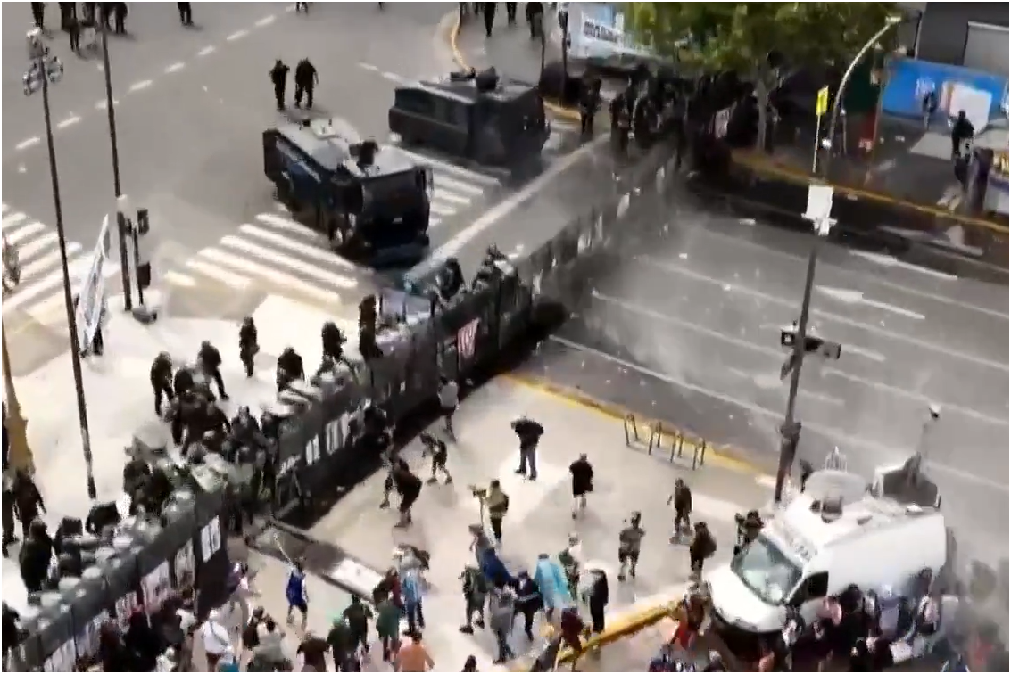 La Represión: Camiones hidrantes y unidades de infantería avanzaron sobre las columnas de la CGT, las CTA y movimientos de izquierda que ocupaban la Avenida Entre Ríos. Se registraron múltiples detonaciones de balas de goma y el uso intensivo de gas pimienta para dispersar a los manifestantes que intentaban derribar el vallado perimetral.