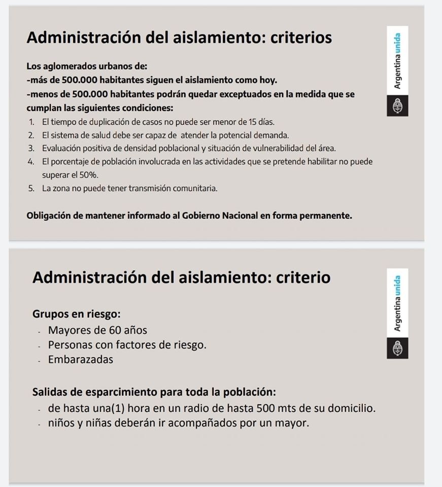Los otros dos requisitos para decidir las excepciones al aislamiento son: que el porcentaje de la población exceptuada de las medidas de aislamiento no podrá superar el 50% de la población total del departamento o partido, y la zona geográfica no podrá estar definida como «con transmisión local o por conglomerado» por la autoridad sanitaria nacional.
