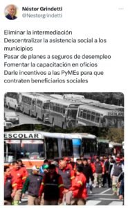 Como parte de una batería de propuestas que abarcan desde eliminar la intermediación de los planes y la descentralización de la asistencia social hacia municipios y gobiernos provinciales hasta relocalizar el ministerio de Desarrollo Social que históricamente se ubica en la intersección de 9 de Julio y Moreno en el corazón del centro porteño, el candidato de Patricia Bullrich en la provincia de Buenos Aires, Néstor Grindetti propone «desincentivar las protestas tomando medidas de corto plazo y mediano plazo, con Patricia Bullrich tenemos la decisión política y la convicción de poder hacerlo».
