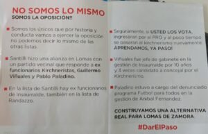La concejal del PRO y precandidata a diputada provincial, Silvia Sierra, apuntó contra el radical Marcelo Pellegrini por la distribución de un volante en el que se criticaba a miembros del PRO y de Hacemos, sectores que confluyen en una de las listas que competirán en las PASO de Juntos de Lomas de Zamora. En el folleto se denuncia a los dirigentes Guillermo Viñuales y Pablo Paladino por su pasado kirchnerista y se advertía sobre la futura fuga de concejales hacia el FdT.