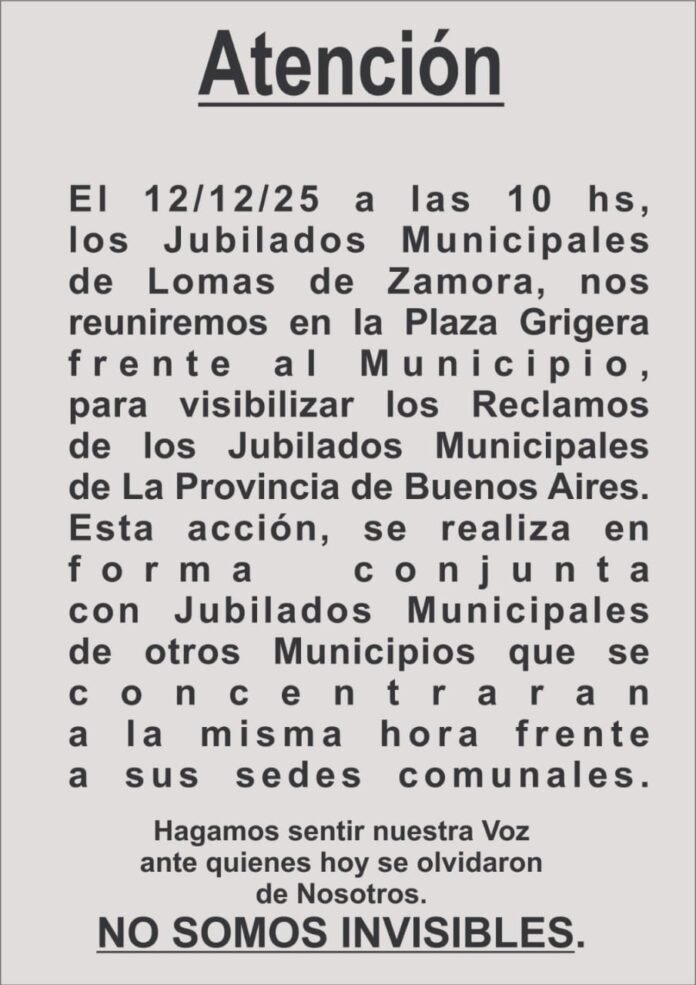 La manifestación en Lomas de Zamora forma parte de una acción conjunta que se replicará en otros distritos de la provincia de Buenos Aires. En simultáneo, jubilados municipales de otros partidos se concentrarán frente a sus respectivas sedes comunales a la misma hora, buscando darle mayor impacto y visibilidad a la problemática a nivel provincial.