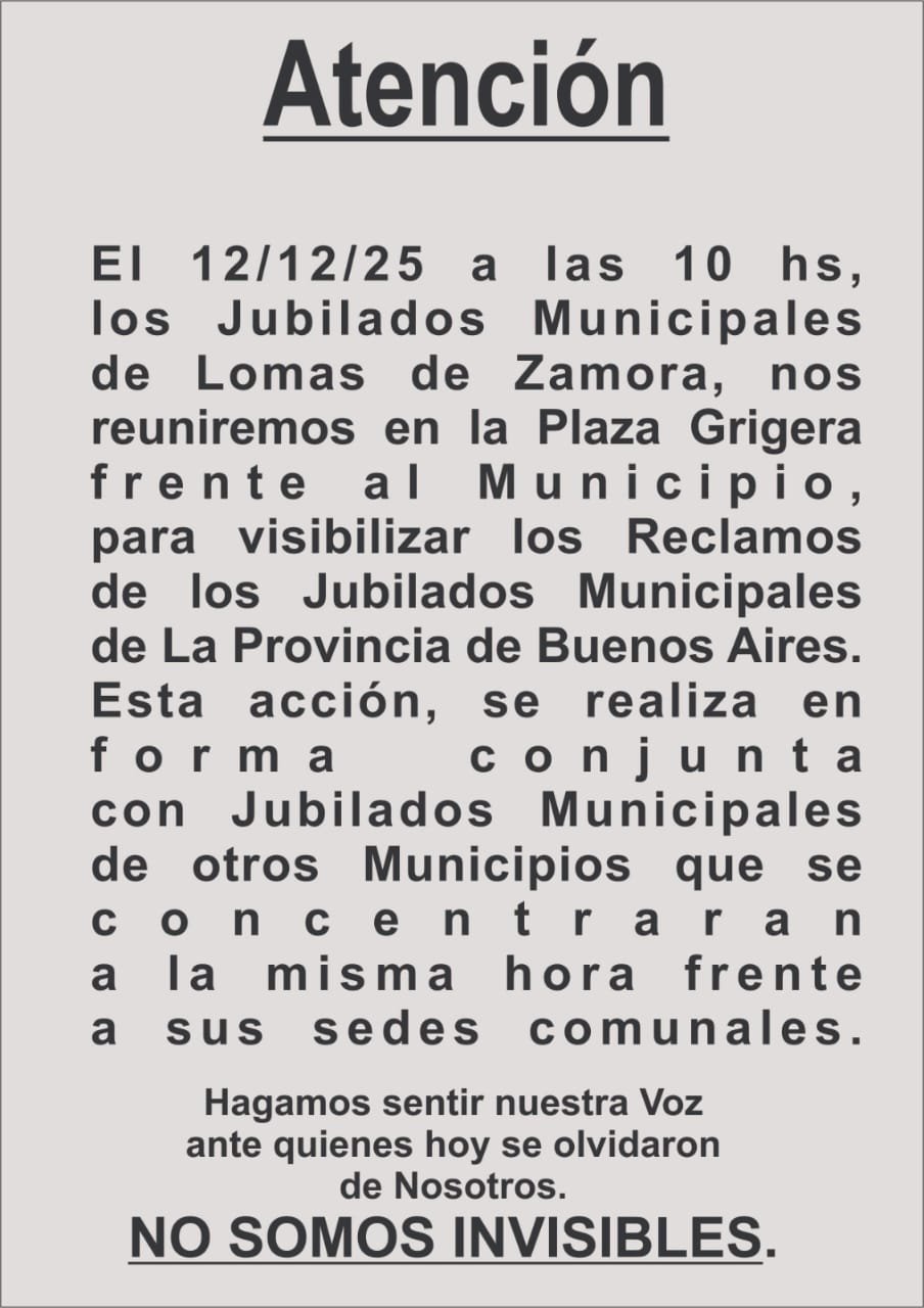 Los Jubilados Municipales de Lomas de Zamora han convocado a una movilización masiva para visibilizar sus reclamos ante las autoridades provinciales, exigiendo una actualización urgente de sus haberes.