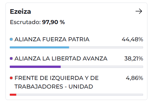 El resultado electoral en Ezeiza refuerza ese planteo. La Alianza Fuerza Patria, que llevó a Granados como candidato, obtuvo el 44,48 % de los votos (43.268 sufragios), superando a La Libertad Avanza, que alcanzó el 38,21 % (37.172 votos). Más atrás quedaron el Frente de Izquierda y de Trabajadores – Unidad con 4,86 % (4.727 votos) y Propuesta Federal para el Cambio con 2,96 % (2.883 votos).