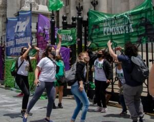Representantes de Nuevo Encuentro, del MST, del Movimiento Evita, La Cámpora, Liberación Popular, entre otras organizaciones, se dieron cita respetando el uso de barbijos, en una jornada soleada y ventosa, acompañada con cánticos por el derecho al aborto y música en la que hasta se coló «La mano de Dios», en recuerdo del astro fútbolístico Diego Maradona.