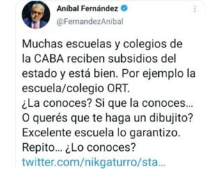 En respuesta, Fernández le contestó: «Muchos colegios y escuelas de la CABA reciben subsidios del Estado y está bien. Por ejemplo la escuela/colegio ORT. ¿La conocés? Sí que la conocés, ¿O querés que te haga un dibujito? Excelente escuela, lo garantizo. Repito: ¿la conocés?».