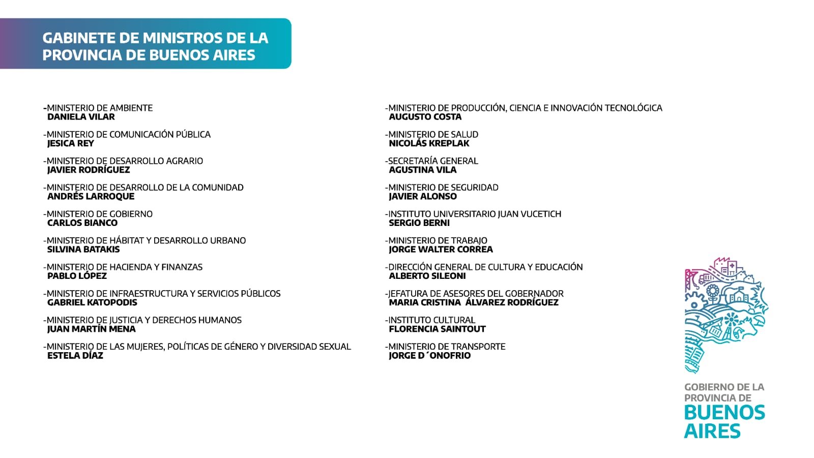 Andrés Larroque seguirá al frente del Ministerio de Desarrollo de la Comunidad y Pablo López permanecerá en el Ministerio de Hacienda y Finanzas. Augusto Costa continuará a cargo del Ministerio de Producción, Ciencia e Innovación Tecnológica; Nicolás Kreplak hará lo propio en Salud; Walter Correa en Trabajo y Alberto Sileoni en la Dirección General de Cultura y Educación. Daniela Vilar tendrá a su cargo el Ministerio de Ambiente, al igual que Javier Rodríguez quien continuará en el Ministerio de Desarrollo Agrario; Agustina Vila seguirá en la Secretaría General; Estela Díaz en el Ministerio de Mujeres, Políticas de Género y Diversidad Sexual, y Jesica Rey en Comunicación Pública.