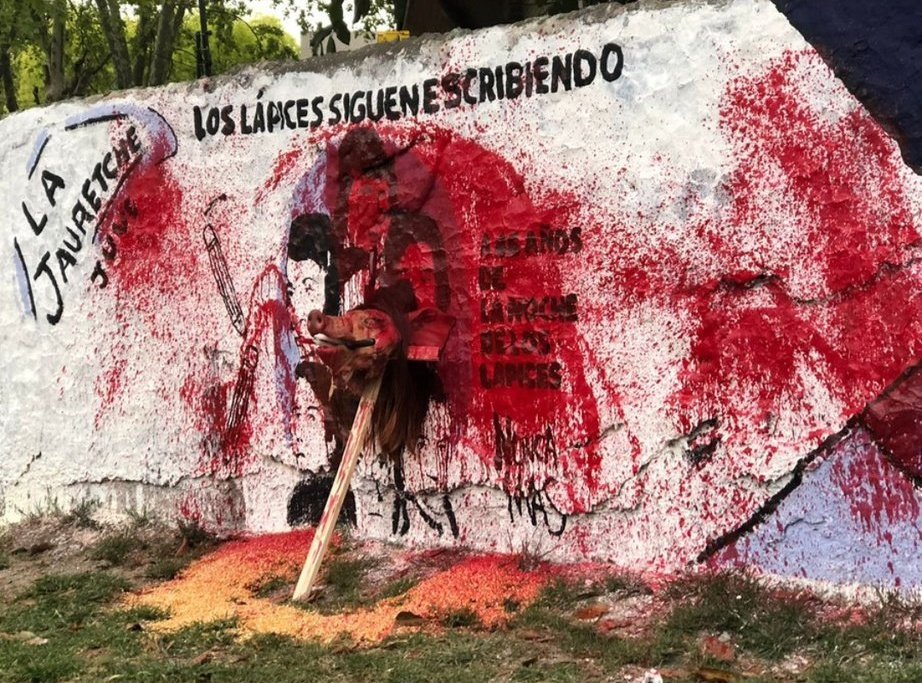 La intendenta Mayra Mendoza publicó en Twitter una foto del mural que recuerda la Noche de los Lápices, titulado «Los lápices siguen escribiendo», donde se lo puede observar vandalizado con pintura roja y con una cruz con una cabeza de cerdo apoyada en la pared.
