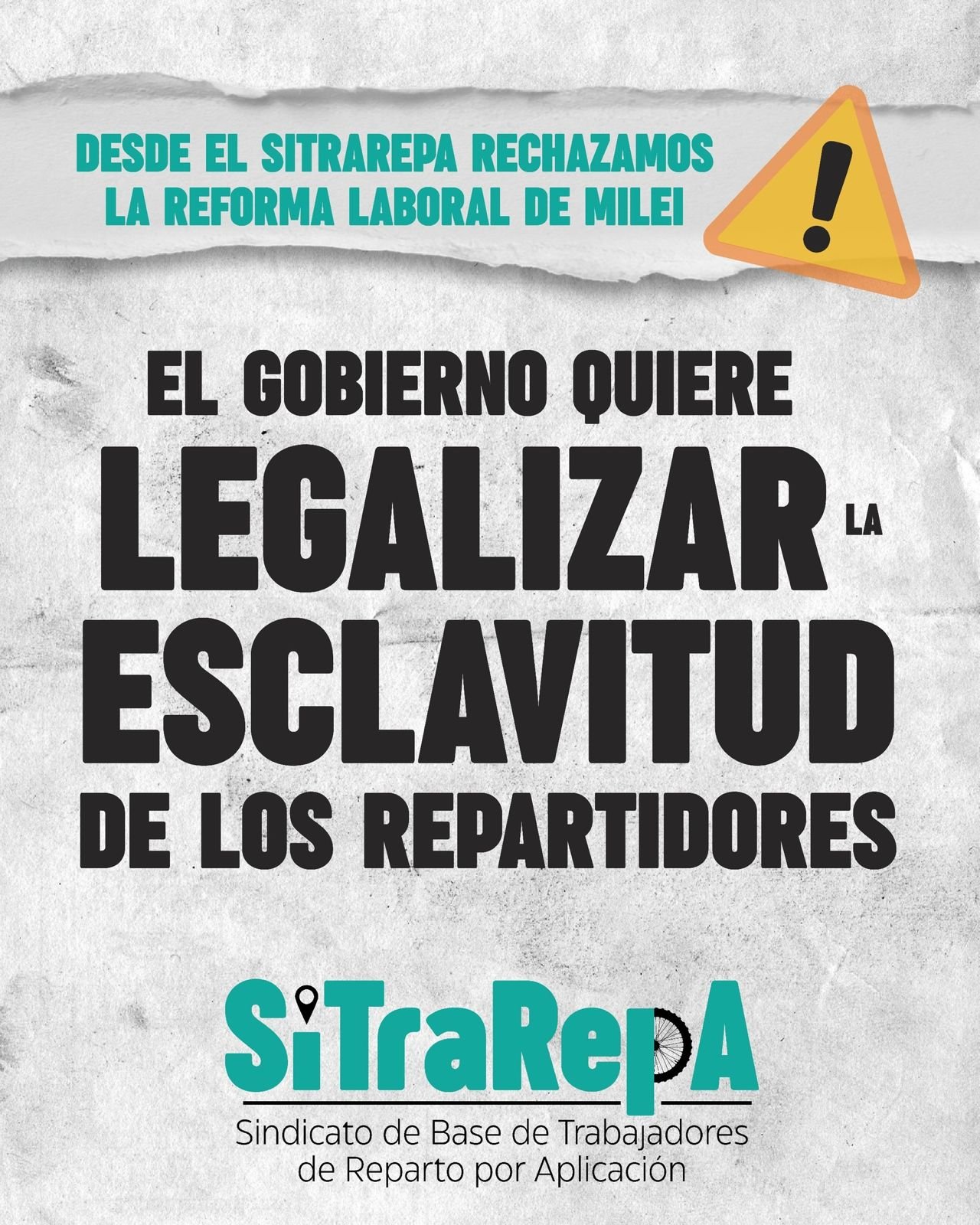 El Sindicato de Trabajadores de Reparto por Aplicación (SiTraRepA) ha anunciado una movilización masiva para este jueves 18 de diciembre en rechazo a la reforma laboral impulsada por el gobierno, a la que califican de «profundamente regresiva» y un «ataque» directo a los derechos de la clase trabajadora.