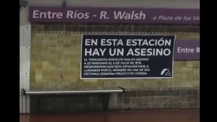 Militantes de Jóvenes Republicanos, pertenecientes a la corriente Unión Republicana, vandalizaron este jueves el nombre de Rodolfo Walsh en la estación de subte Entre Ríos en la línea E, en el marco del Día de la Memoria, por la Verdad y la Justicia. «ATENCIÓN: hay un asesino en la estación», publicaron en sus redes sociales. También, propusieron que la estación se denomine «Josefina Melucci de Cepeda».
