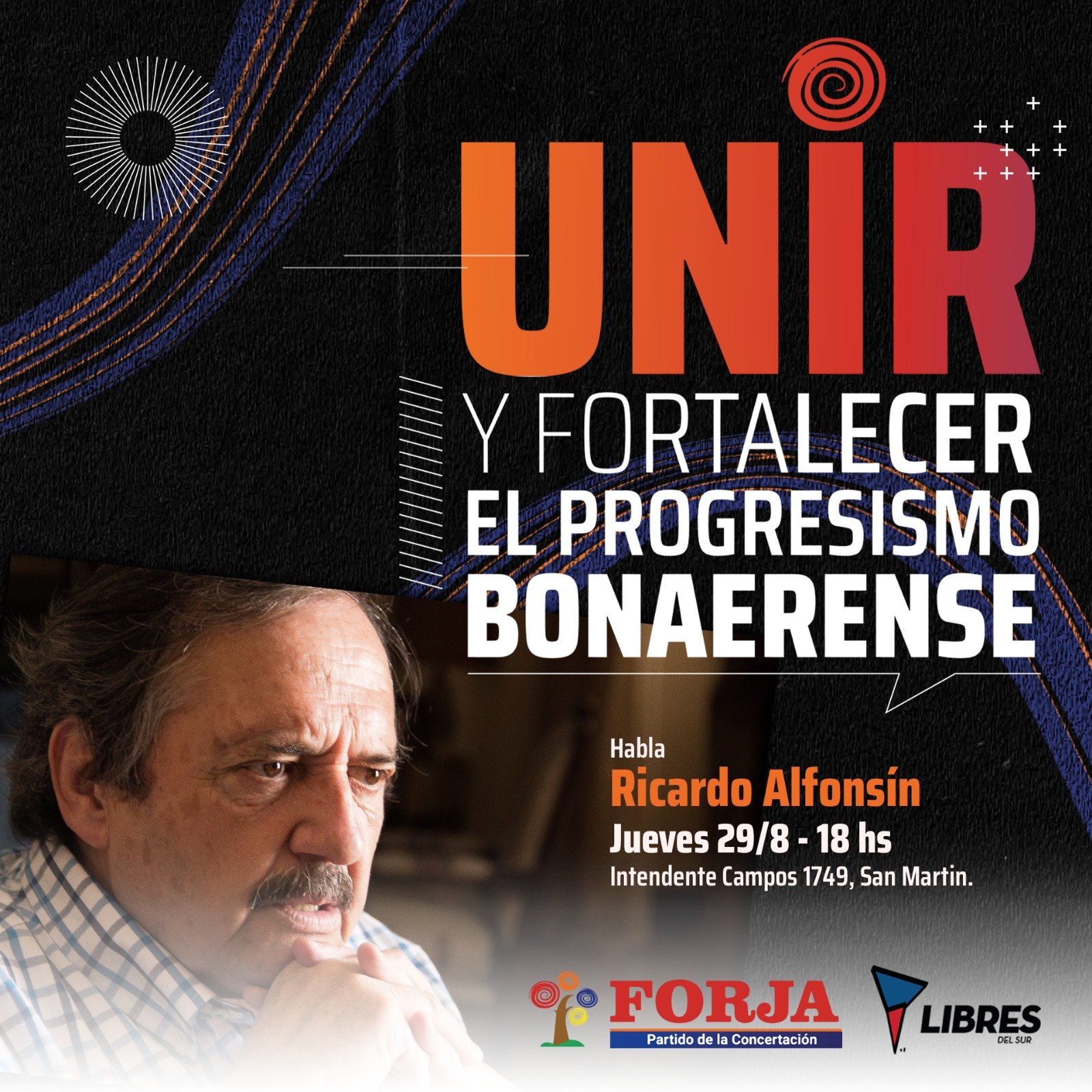 El referente radical Ricardo Alfonsín convoca a la construcción de un frente para “unir y fortalecer al progresismo» en la provincia de Buenos Aires, junto a Forja y Libres del Sur el próximo 29/8 a las 18h en Intendente Campos 1749, San Martín, provincia de Buenos Aires (Delegación San Martín de La Bancaria).