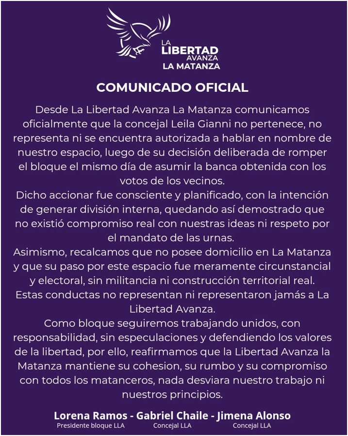 En el texto, firmado por los concejales Lorena Ramos, Gabriel Chaile y Jimena Alonso, se afirma que Gianni “no pertenece, no representa ni se encuentra autorizada a hablar en nombre del espacio”, y se recalca que su paso por LLA fue “meramente circunstancial y electoral, sin militancia ni construcción territorial real”.