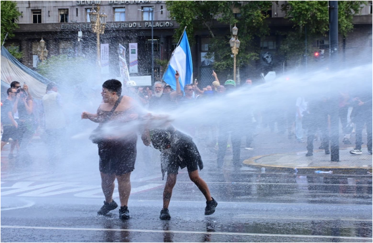 Gendarmería Nacional utilizó camiones hidrantes para dispersar a los grupos más cercanos a las vallas.