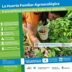 Los encuentros comenzarán el día miércoles 14 de abril, a partir de las 14 horas y será emitido en vivo a través del canal de Youtube INTA AMBA, con acceso libre y gratuito, y continuarán semanalmente hasta el 19 de mayo. Cada jornada contará con especialistas de toda la provincia de Buenos Aires, lo que le permitirá al público encontrarse con una mayor diversidad de profesionales e intercambio de estrategias de manejo de la huerta familiar agroecológica para la temporada otoño e invierno.