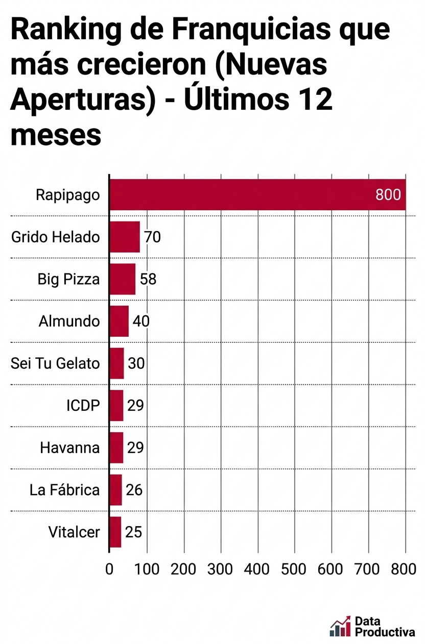Consumo masivo de «ticket bajo»: El rubro heladerías y pizzerías de bajo costo como Grido (70), Big Pizza (58) y Sei Tu (30) ocupan el podio, lo que confirma que el inversor está buscando negocios de alta rotación y precios populares.