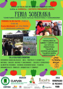 La Feria Soberana “Conectando mano a mano familias productoras y consumidores”, realizará una nueva edición, con distanciamientos y protocolos sanitarios, el viernes 14 de mayo de 9 a 17 horas en Guernica, Presidente Perón, en la Plaza Belgrano, avenida Eva Perón y Crisólogo Larralde. Acompaña esta iniciativa la Agencia San Vicente del INTA AMBA.