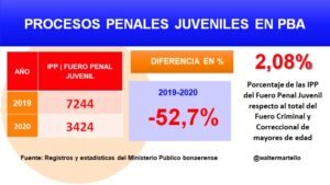 “La situación se ve con mayor claridad si comparamos lo sucedido durante la última década. En 2009, los procesos iniciados en el Fuero de Responsabilidad Penal Juvenil representaban el 4,54% del total de IPP abiertas en la Provincia y ese indicador se ubicó en menos de la mitad 2,08% durante el año pasado. Estos datos fueron procesados a partir de la información que aporta la Procuración bonaerense que, como se sabe, tiene una conducción que no está ligada al actual Poder Ejecutivo”, explicó Martello, a cargo del Observatorio de Derechos de Niñas, Niños y Adolescentes de la Defensoría del Pueblo.