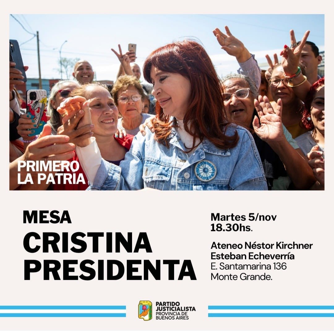 Según informaron, en Esteban Echeverría, al igual que en otros distritos de la región, se lanzará la Mesa Cristina Presidenta, y será el próximo martes 5v de noviembre en la sede del Ateneo Néstor Kirchner, Enrique Santamarina 136, Monte Grande. «Lo hacemos en el Ateneo, me hubiera gustado que sea en la sede del PJ, pero estos mismos que dicen que cooptan elecciones, cooptan el PJ, mirá que hacen con el PJ de Echeverría.»