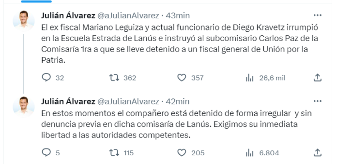 «El ex fiscal Mariano Leguiza y actual funcionario de Diego Kravetz, irrumpió en la Escuela Estrada de Lanús e instruyó al subcomisario Carlos Paz de la Comisaría 1ra a que se lleve detenido a un fiscal general de Unión por la Patria», denunció Julián Álvarez dando cuenta el procedimiento que se dio en la institución de Piñeiro al 400 en lo que sería un escándalo en plena elección.