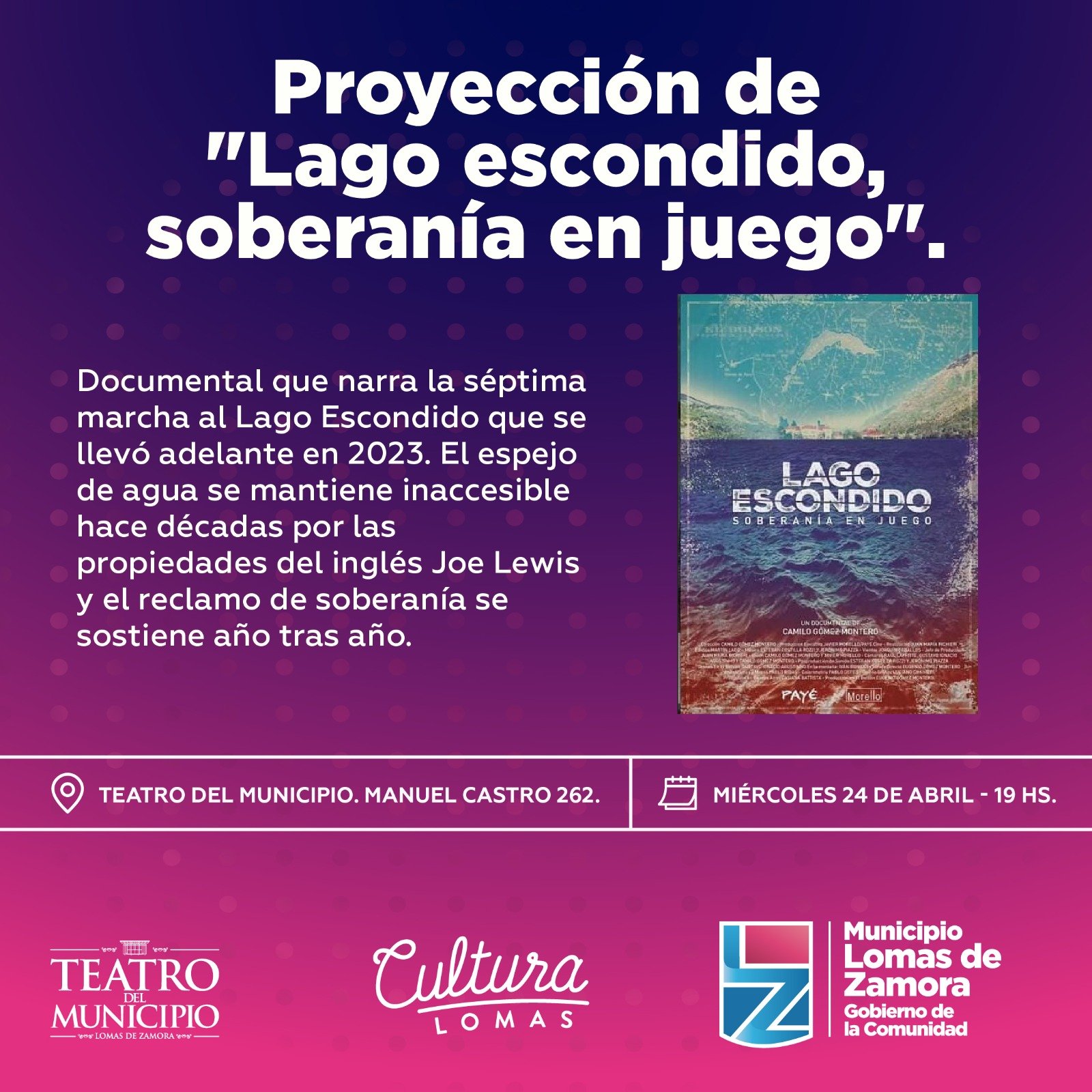 Este miércoles 24 de abril se producirá, en el Teatro Municipal de Lomas de Zamora, la proyección de la película “Lago Escondido, soberanía en juego”, un documental de Camilo Gómez Montero. El horario de la convocatoria es el de las 19 horas. La entrada es libre y gratuita.