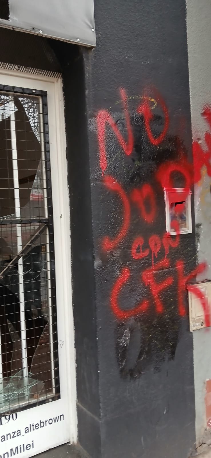 El coordinador de La Libertad Avanza en Almirante Brown, Juan Pedro Aquino, repudió el ataque vandálico al local partidario ubicado en Av. Espora 885, en Adrogué, y advirtió que se trata de “un intento de infundir miedo que no va a lograr su cometido”. Según detalló, el hecho ocurrió en la madrugada del lunes, cuando desconocidos rompieron vidrios, pintaron la fachada y dañaron el lugar.