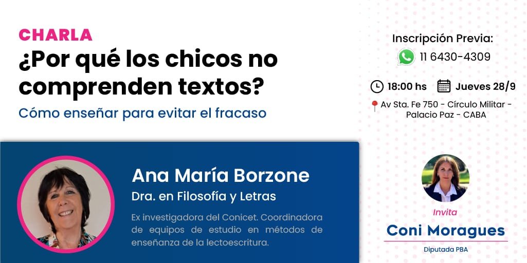 Por otra parte, Constanza Moragues anunció una charla titulada «¿Por qué los chicos no comprenden los textos? Como enseñar para evitar el fracaso», cuya principal exponente será la Doctora en Filosofía y en Letras, y ex investigadora del Conicet, Ana María Borzone, que se efectuará en el Salón de Círculo Militar, Av. Santa Fe 750, CABA.