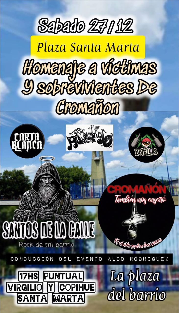 El 3er. Festival Homenaje a las Víctimas y Sobrevivientes de Cromañón se llevará a cabo de manera autogestiva el próximo sábado 27 de diciembre a partir de las 17 horas en la Plaza Santa Marta de Lomas de Zamora, ubicada en Intendente Bruno Tavano al 1600.