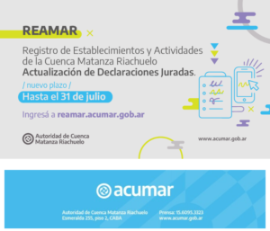 A través de la Disposición 129/2022, se prorrogó el plazo establecido para la actualización de datos obligatoria que deben realizar las empresas industriales, comerciales, de servicios o actividad, que se encuentren radicadas en el ámbito de la Cuenca. Este trámite debe realizarse antes del 31 de julio de 2022, mediante la presentación de la Declaración Jurada Electrónica en el Registro de Establecimientos y Actividades de la Cuenca Matanza Riachuelo (REAMAR).
