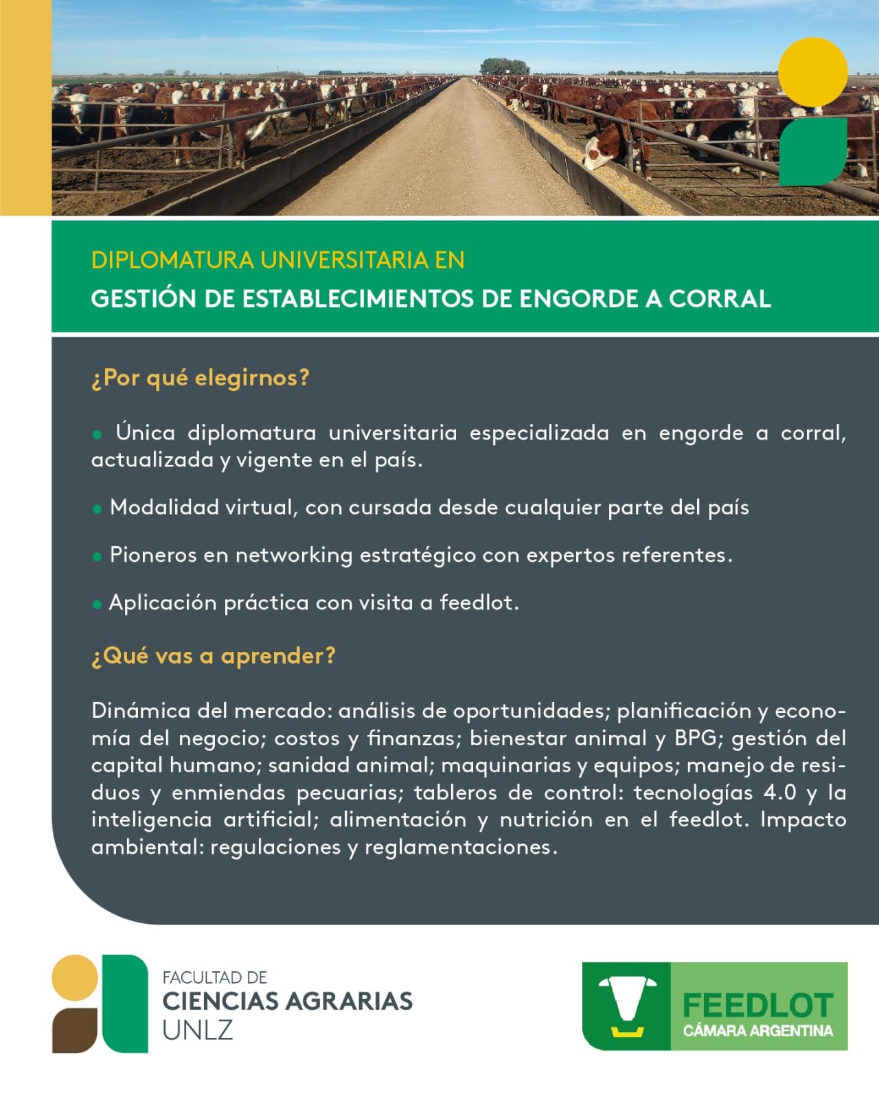 La diplomatura surge de un convenio entre Agrarias-UNLZ y la Cámara Argentina de Feedlot, consolidando un modelo de formación que integra universidad y producción. Los socios de la CAF cuentan con un 20% de descuento en el arancel.