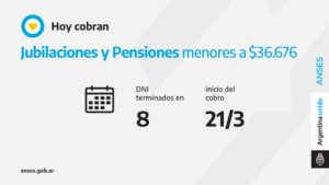 Las sucursales bancarias habilitadas atenderán por ventanilla a jubilados, jubiladas, pensionados y pensionadas con documentos terminados en 8 cuyos haberes NO SUPEREN la suma de 36.676 pesos.