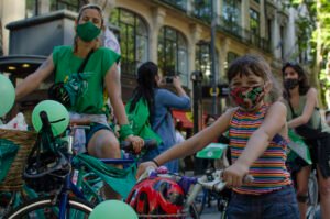 La Colectiva Feminista “La Revuelta” de Neuquén también se sumó al reclamo con una “bicicleteada y bengaleada”.