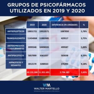 Durante su exposición en un conversatorio virtual, organizado por el Ministerio de la Ciudadanía de Neuquén, Martello destacó que “los indicadores más recientes de la Confederación Farmacéutica Argentina, que monitoreamos periódicamente desde el Observatorio de Adicciones y Consumos Problemáticos de la Defensoría, nos muestran que en plena pandemia se vendieron en la Argentina casi 52 millones de psicofármacos, alrededor de 2,8 millones unidades más respecto a lo registrado en 2019”.
