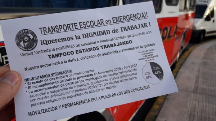 Conductores de micros escolares del conurbano bonaerense y de la ciudad de Buenos Aires comenzaron esta mañana una protesta frente al Congreso nacional, en reclamo de una «ampliación del aforo» para poder transportar una mayor cantidad de estudiantes a los establecimientos educativos.