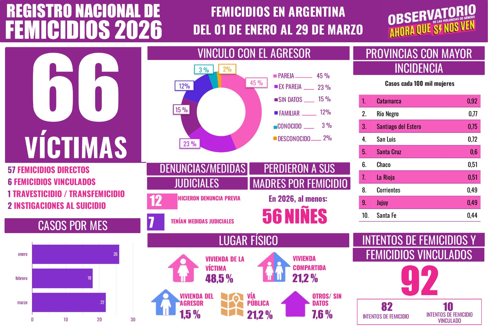 El desglose de los datos es estremecedor: de las 66 víctimas, 57 corresponden a femicidios directos, 6 a femicidios vinculados, se registraron 2 instigaciones al suicidio y un travesticidio/transfemicidio. Solo en el mes de marzo, se contabilizaron 22 casos.