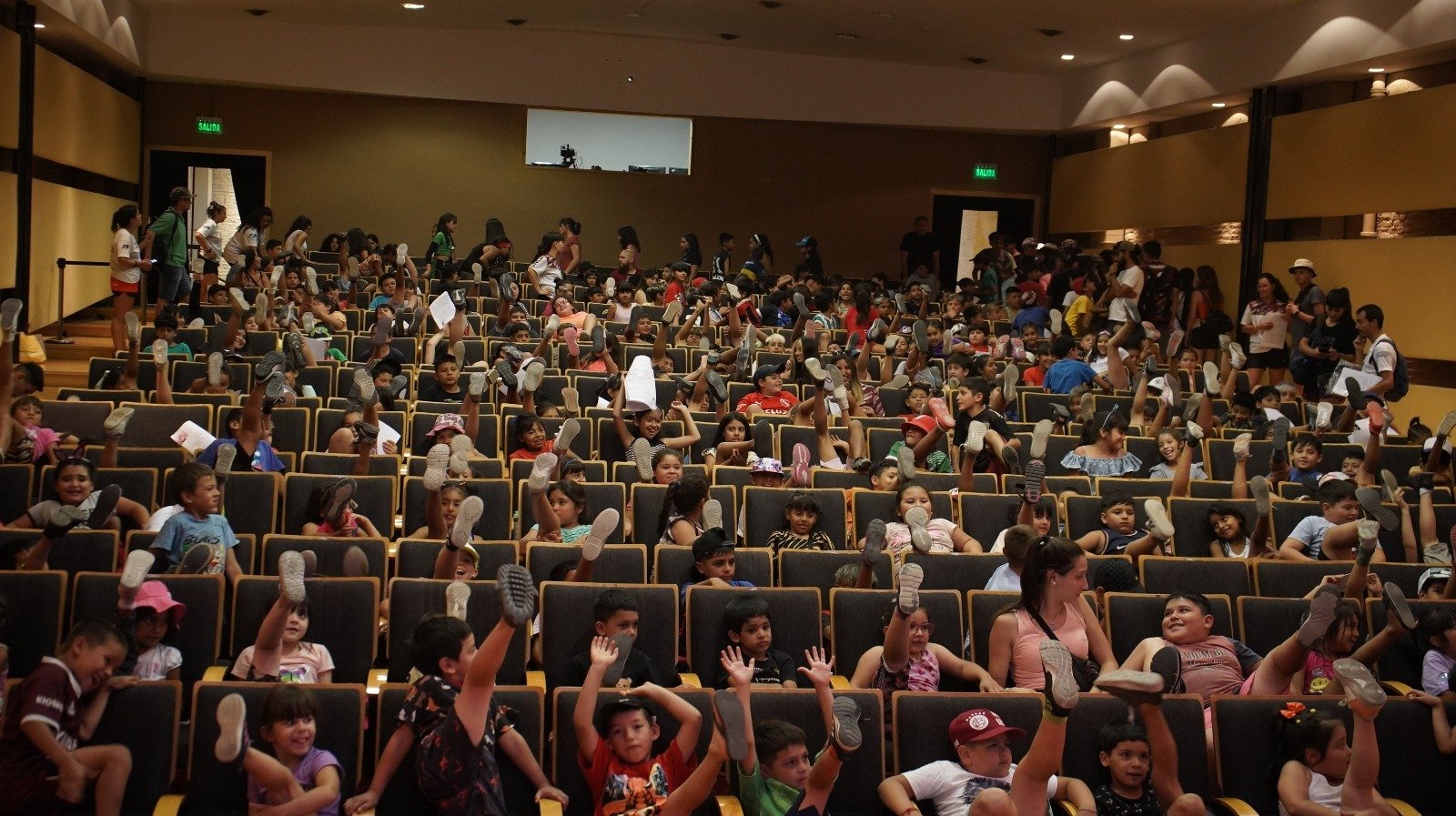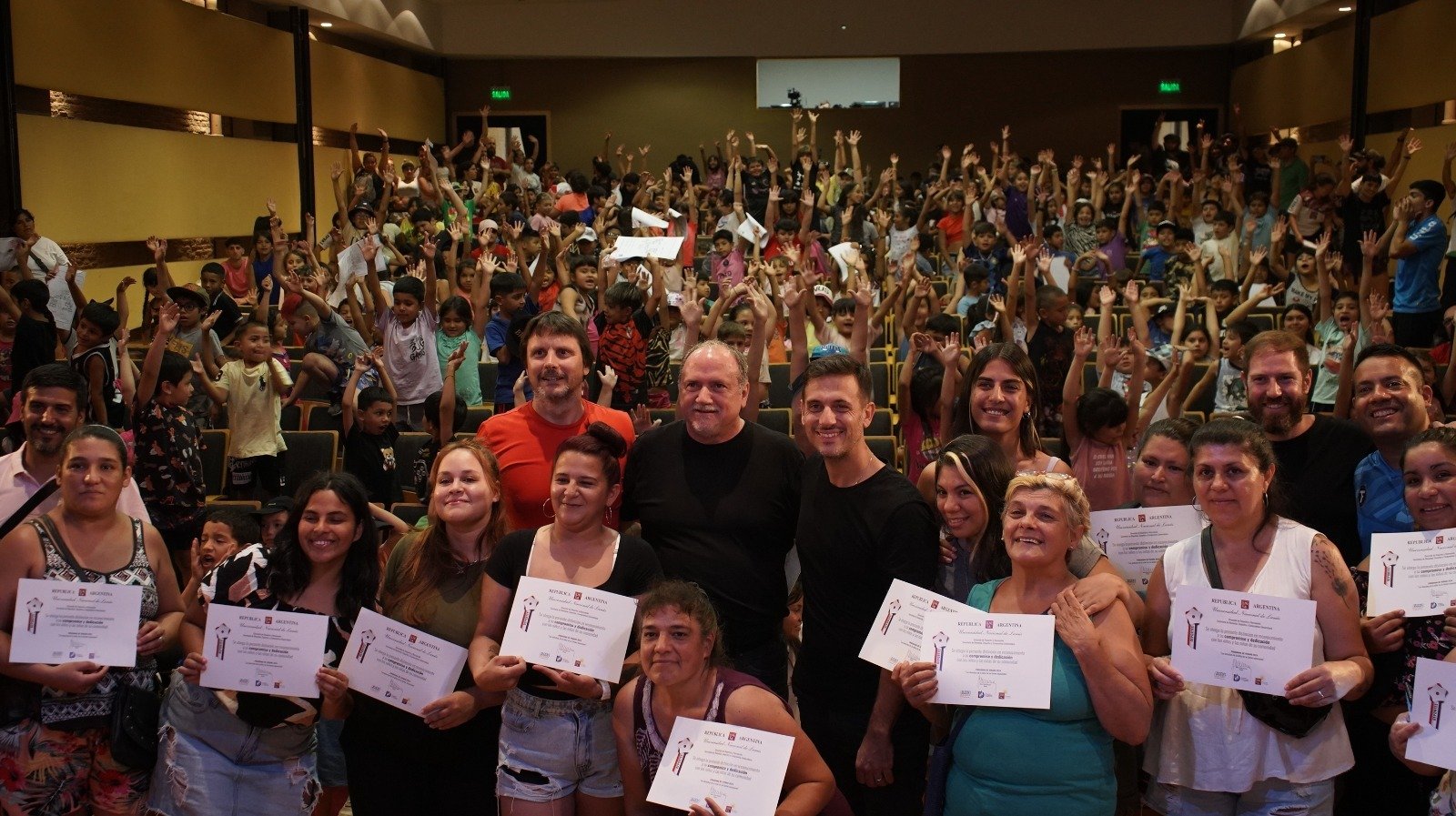 La tarde comenzó con los chicos bailando y cantando a todo ritmo “La Morocha” del cantante cordobés Luck Ra, y el hit mundialista “Muchachos”, en un Aula Magna Bicentenario colmada.