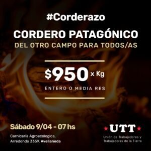 La Unión de Trabajadores y Trabajadoras de la Tierra (UTT) demuestra una vez más que es posible producir alimentos sanos y construir canales de comercialización justa para la ciudadanía. Es por eso que el sábado 9 de abril se lanza un nueva iniciativa, con la venta directa de 350 corderos patagónicos a $950 por kg., fruto del trabajo de las familias campesinas del sur del país, alimentados a base de pastura natural, sin hormonas, ni productos ultra procesados.