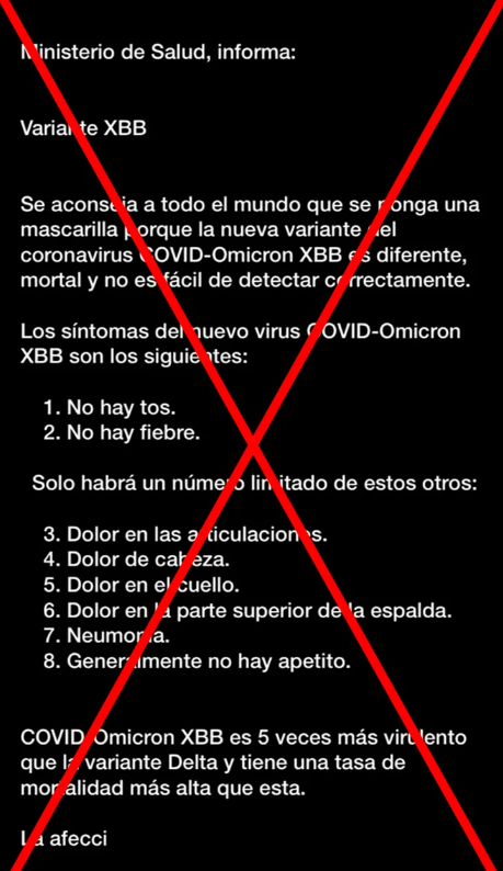 Se trata de un texto que circula por whattsApp que da cuenta de «la variante XBB». «El nuevo sublinaje del COVID-19 no es más mortal ni provoca síntomas diferentes», indicaron desde la cartera sanitaria.