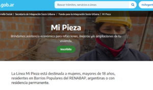 El Ministerio de Desarrollo Social anunció la apertura de una nueva etapa de inscripción para el programa Mi Pieza, destinado a mujeres de los barrios que conforman el (ReNaBaP) y que necesiten ampliar o refaccionar sus viviendas.