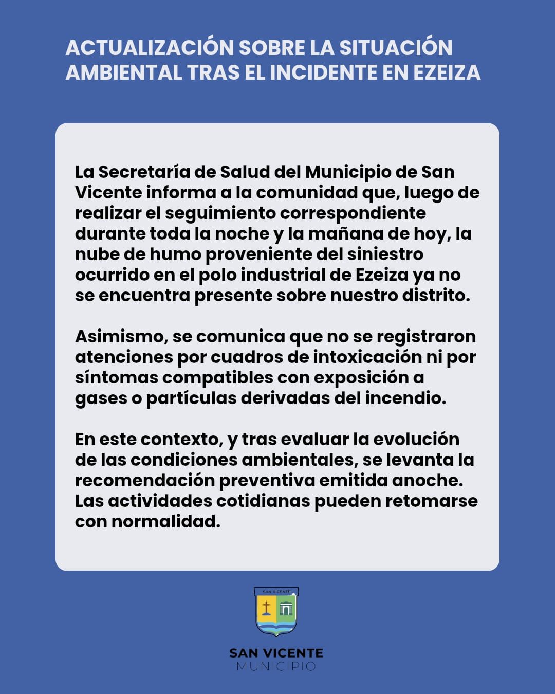 La Secretaría de Salud del Municipio de San Vicente confirmó que la nube de humo generada por el incendio en el polo industrial de Ezeiza ya no afecta al distrito. Tras un monitoreo nocturno y matutino, se descartaron casos de intoxicación o síntomas compatibles con exposición a gases o partículas.