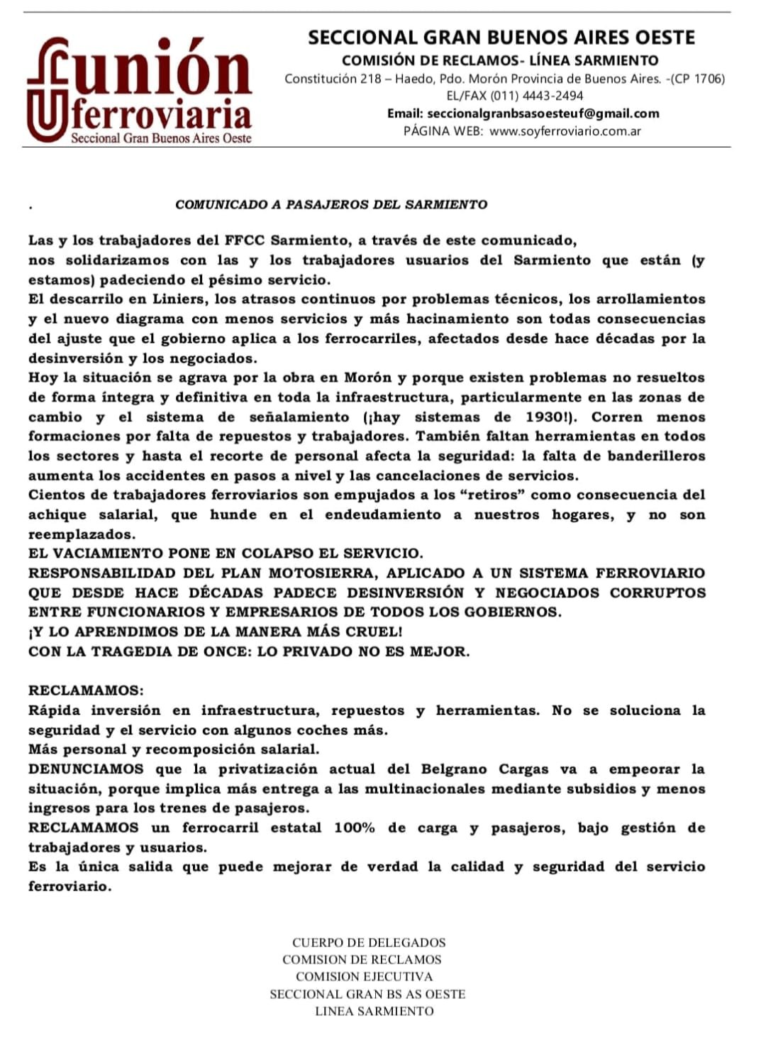 El servicio de la Línea Sarmiento atraviesa una de sus peores crisis, marcada por descarrilamientos, atrasos continuos y una notoria reducción de frecuencias. Ante esta situación, el cuerpo de delegados de la Seccional Gran Buenos Aires Oeste emitió un fuerte comunicado dirigido directamente a los pasajeros, en el que se solidarizan con los usuarios por el «pésimo servicio» y denuncian que la causa es el «vaciamiento» y el «ajuste» aplicado al sistema ferroviario.