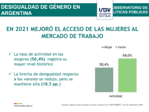 La principal causa que explica la desigualdad de género en el plano económico es la pobreza de tiempo que sufren las mujeres por dedicar una jornada laboral al trabajo doméstico y de cuidados no remunerado (TDCNR). En el tercer trimestre 2021, la EPH nos muestra que del total de personas que realizó tareas en el hogar, el 72% fueron mujeres y solo el 28% varones. Este indicador muestra una leve mejora, ya que doce meses atrás la distribución era de 74% y 26%, respectivamente. Un informe de Políticas económicas de la Universidad Nacional de Avellaneda (UNdAv).