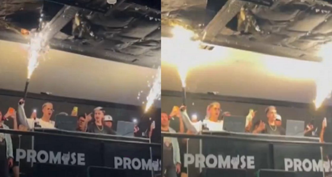 En los videos se puede apreciar como una de las chispas de las bengalas roza el techo y hasta llegó a prenderse parte del mismo.