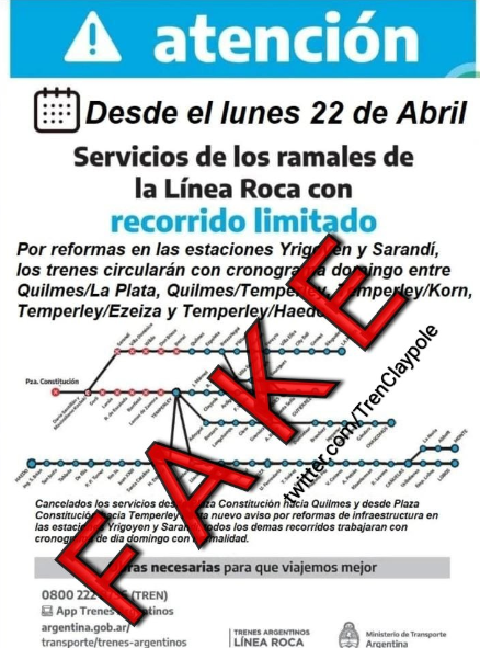 Sin embargo, las autoridades de Trenes Argentinos desestimaron esta versión calificándola de «es falsa», aunque reconocieron que «vamos a tener una afectación esta semana seguramente, pero no es la que está marcada en este fake».