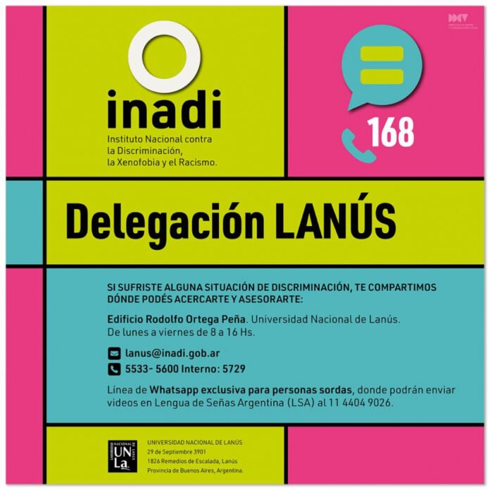 La Delegación Lanús del Inadi (29 de Septiembre 3901, Remedios de Escalada) atiende en la sede de lunes a viernes de 8 a 16. También existe la posibilidad de comunicarse por correo electrónico a lanus@inadi.gob.ar y por teléfono al 5533-5600 interno 5729. Además, hay una línea de Whatsapp exclusiva para personas sordas, donde podrán enviar videos en Lengua de Señas Argentina (LSA). El número es 11 4404 9026.