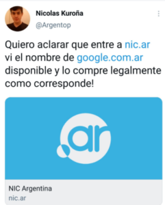 “Vi el nombre de google.com.ar disponible y lo compré, legalmente como corresponde”, explicó el usuario de Twitter @argentop.