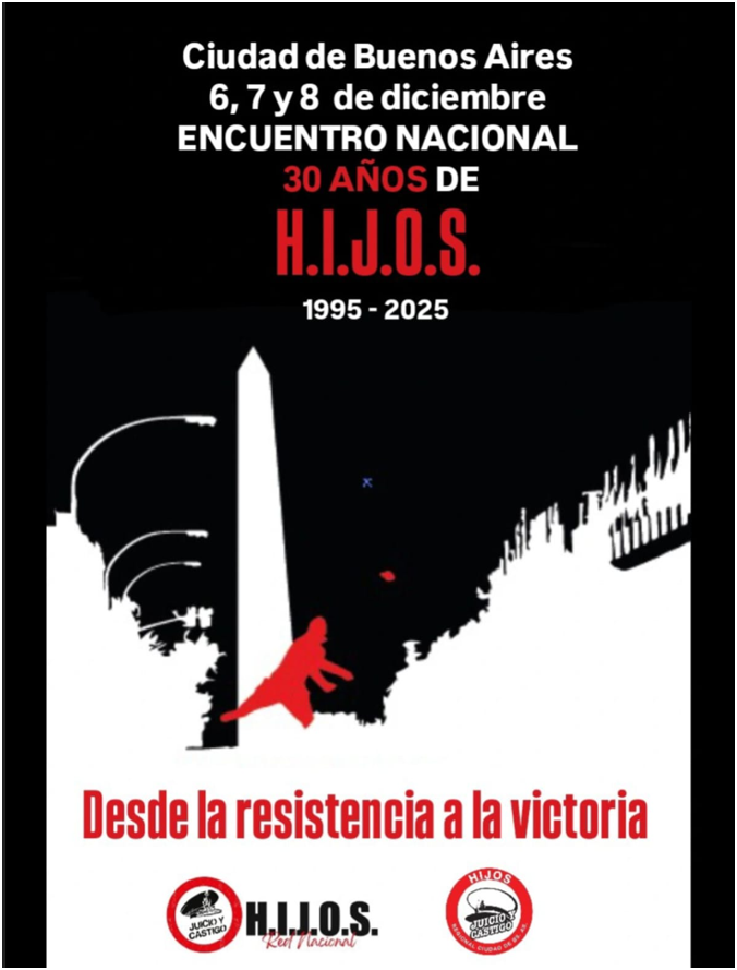 La organización H.I.J.O.S. (Hijas e Hijos por la Identidad y la Justicia, contra el Olvido y el Silencio / 1995-2025) conmemora sus 30 años de existencia con un Encuentro de la Red Nacional, reuniendo a sus regionales de todo el país. Bajo el lema «30 años – Desde la Resistencia a la Victoria» , el evento, que se lleva a cabo en la Ciudad de Buenos Aires los días 6, 7 y 8 de diciembre , busca ser la instancia máxima de debate y deliberación del espacio.