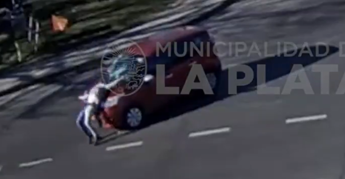 El episodio quedó registrado en las cámaras de seguridad del municipio, donde se puede observar a un transeúnte corriendo y arrojándose sobre el parabrisas de un vehículo en plena marcha.